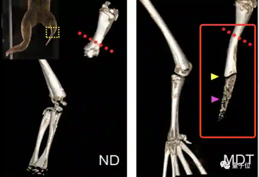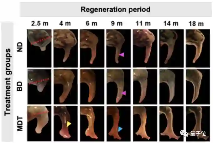 可以看到,最下面的MDT组,也就是用了五种药物的断肢青蛙在2.5月的时间内就长出了更长的组织(红色虚线为截肢处)。