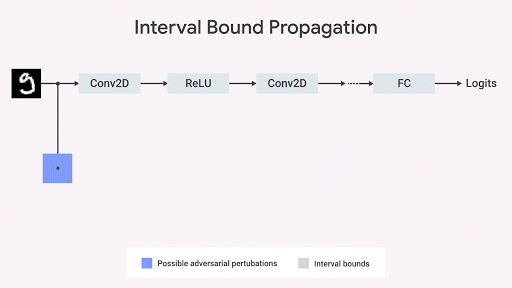 受此观察的启发,一些研究人员(Raghunathan et al,2018; Wong et al,2018; Mirman et al,2018; Wang et al,2018),包括我们在 DeepMind 的团队(Dvijotham et al,2018; Gowal et al.,2018),研究了与对抗测试程序无关的算法(用于评估与规范的一致性)。这可以从几何学上理解,我们可以通过约束一组给定输入情况下的输出空间来约束与规范相差最大的情况(例如,使用间隔边界传播; Ehlers 2017,Katz et al,2017,Mirman et al,2018)。如果此区间相对于网络参数是可微分的并且可以快速计算,则可以在训练期间使用它。然后可以通过网络的每个层传播原始边界框。