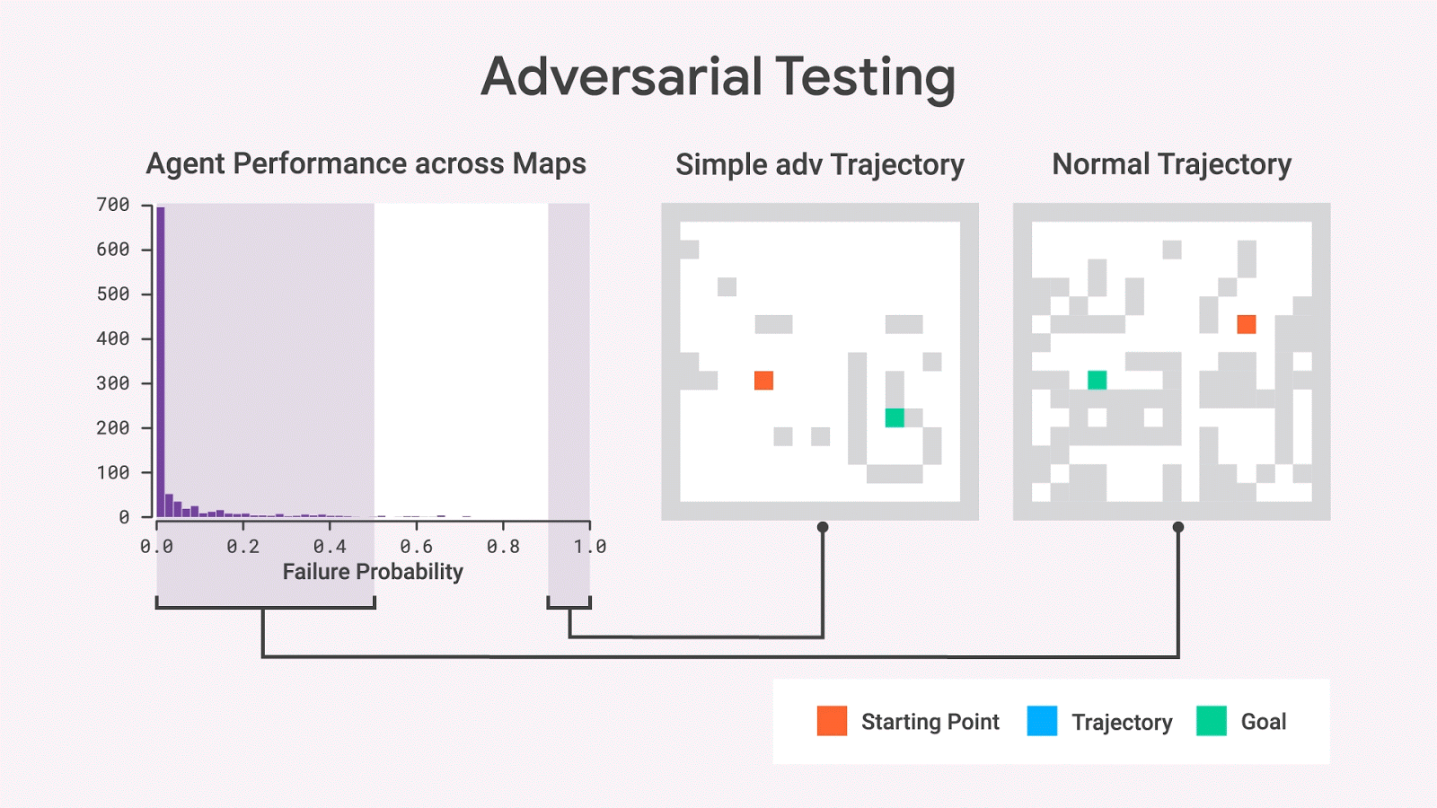 使用随机抽样,我们几乎从不观察具有高失败概率的地图,但是对抗测试表明这样的地图确实存在。即使在移除了许多墙壁,变成比原始地图更简单的地图后,这些地图上的失败概率依然很高。
