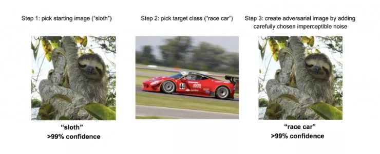 覆盖在典型图像上的对抗输入可能导致分类器将树懒错误地分类为赛车。两个图像在每个像素中最多相差 0.0078。第一张图像被归类为三趾树懒,置信度> 99%。第二张概率>99% 的图像被归类为赛车。