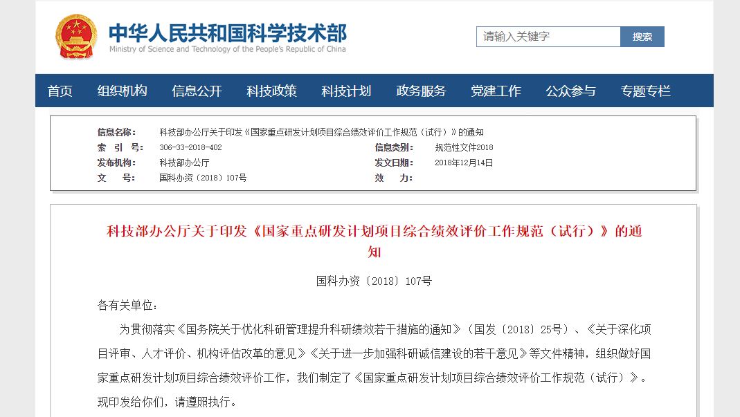 科技部办公厅关于印发《国家重点研发计划项目综合绩效评价工作规范(试行)》的通知