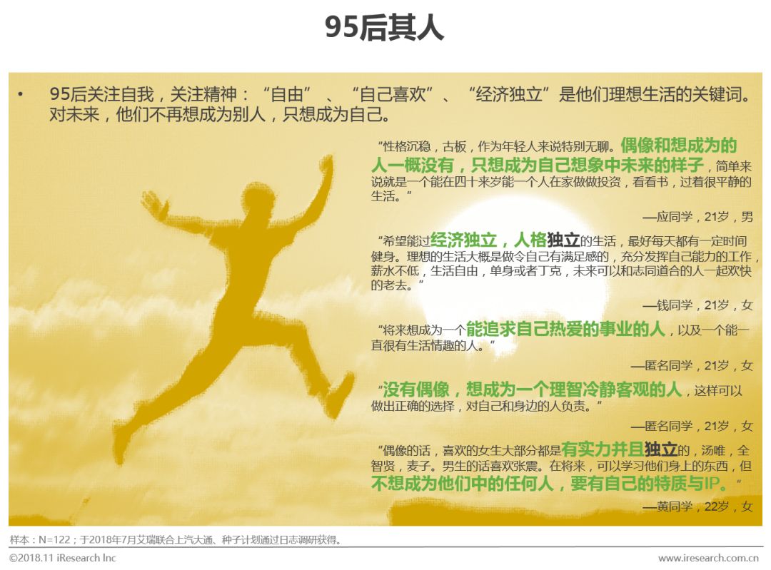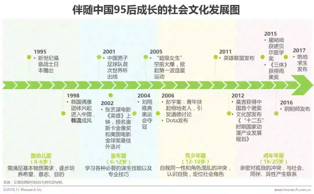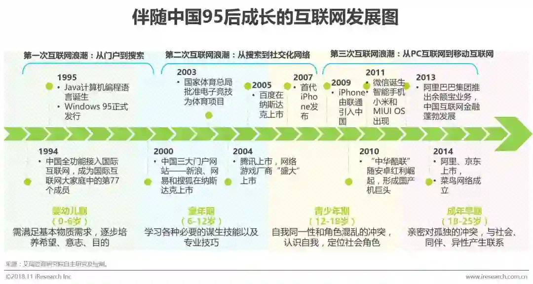 95后诞生时正是中国接入互联网、网络普及的前期,他们在小学上网查看资讯,初中使用智能手机,高中用微信社交,大学使用互联网理财。中国互联网发展的全部历程伴随着95后的成长,影响了95后从思想到行为的各个方面。