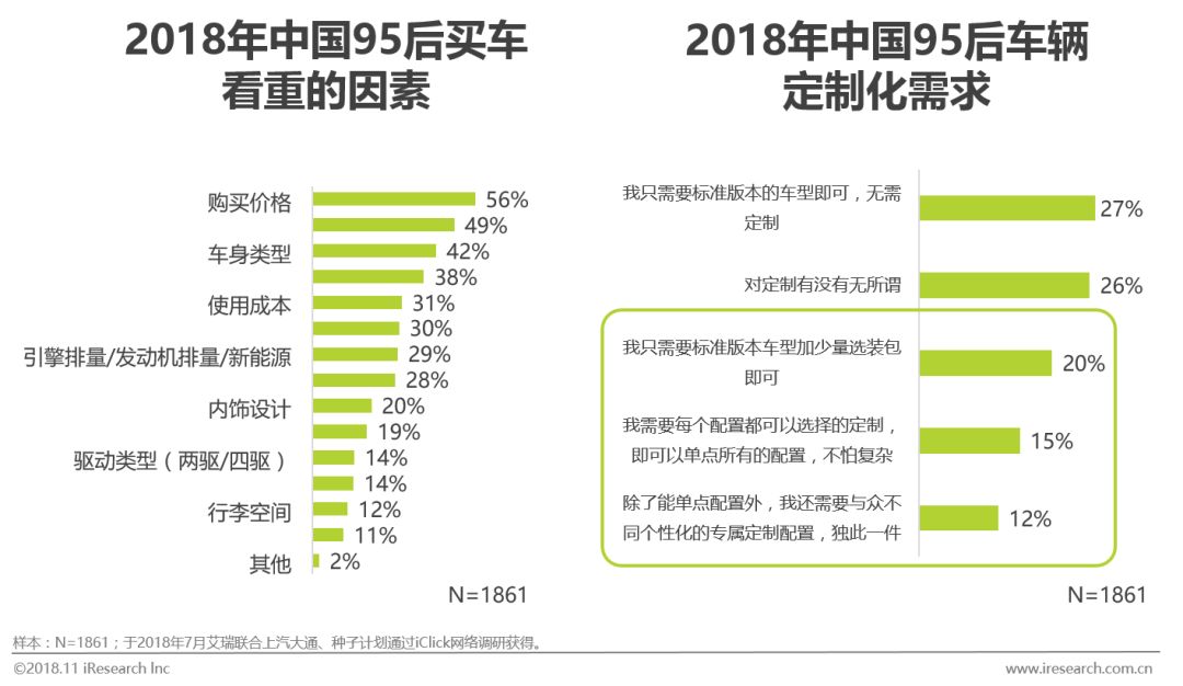 价格、外观和车型是95后买车时考虑最多的因素;品牌教育在95后中仍待开发。当前95后对定制车辆的要求还处于萌芽阶段,车辆定制化需求的未来增长空间巨大。