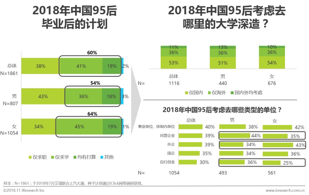 95后当前多处于本科阶段(本次调研本科生占比95%),他们的主流规划是不倾向于就业。有求学计划的95后中,过半考虑国内求学,36%考虑海外求学。计划就业的95后中:国内单位受到的青睐程度不弱于外企,但男女生想法有异,男生有更高的民企及自主创业愿望,而女生相对而言对外企更有好感。