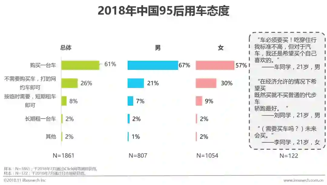 当前,自行购车仍是主流思想;租车、网约车使用日益方便,受此冲击,26%的95后表示“不需要购买车,打的网约车即可”。与女性相比,男性(67%)仍普遍希望自己能拥有一辆车。