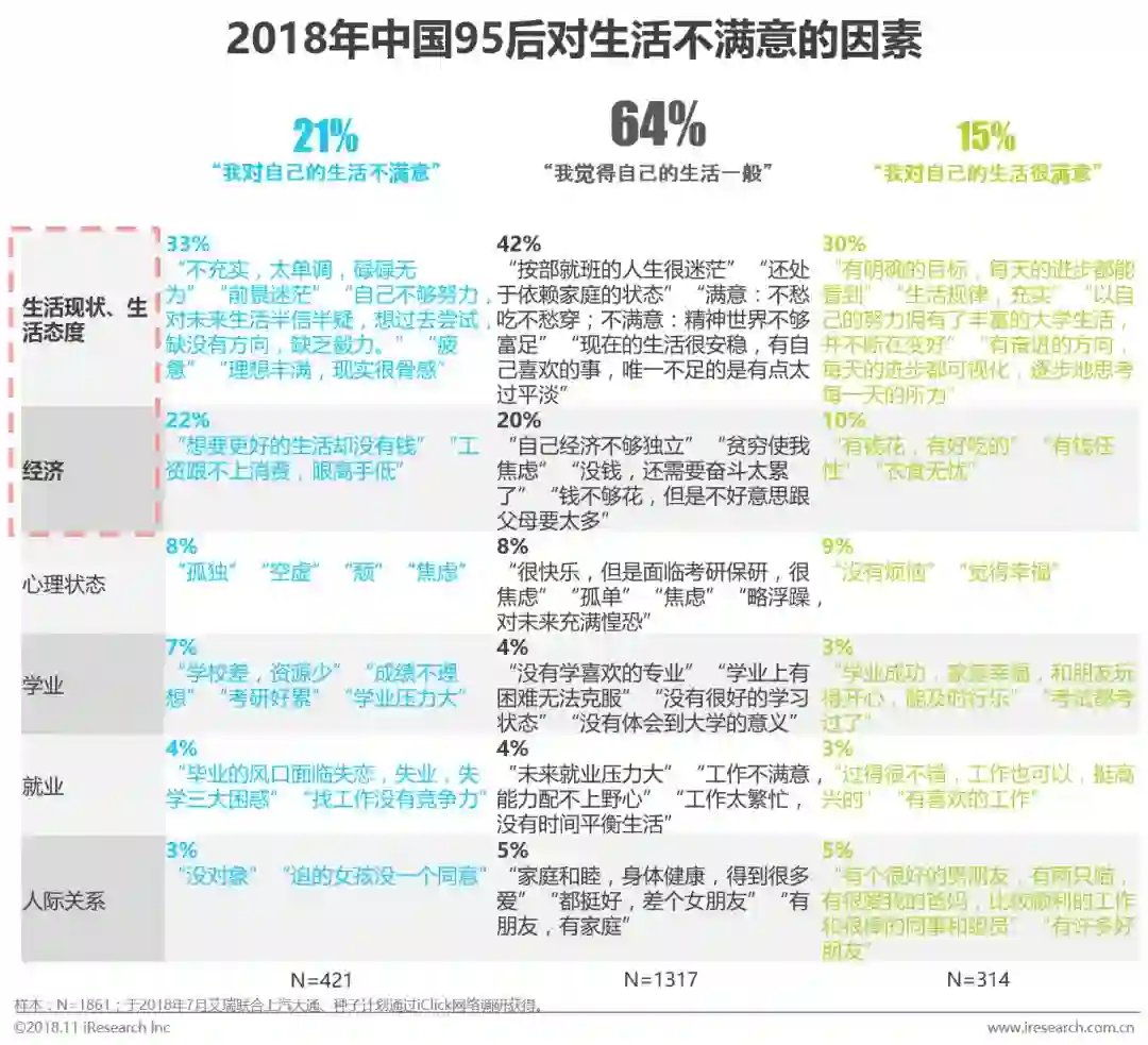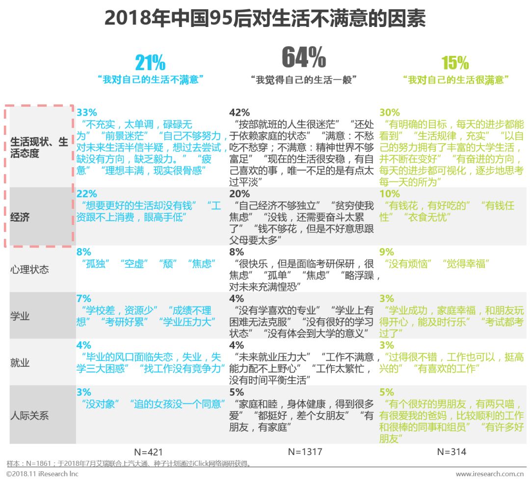 95后对物质和精神方面都有更高的要求。精神上,他们希望生活充实、有规划,能一步一步实现自己设立的目标;物质上,他们期待经济独立、满足更高的消费需求。当前64%的95后认为自己的生活一般,主要原因还是他们的生活现状、物质水平未达到理想情况。