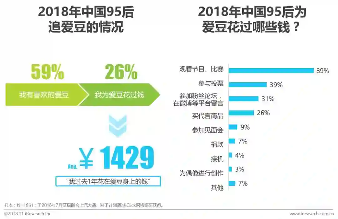 59%的95后都有自己喜欢的爱豆;26%的95后给爱豆花过钱,平均一年1429元。
