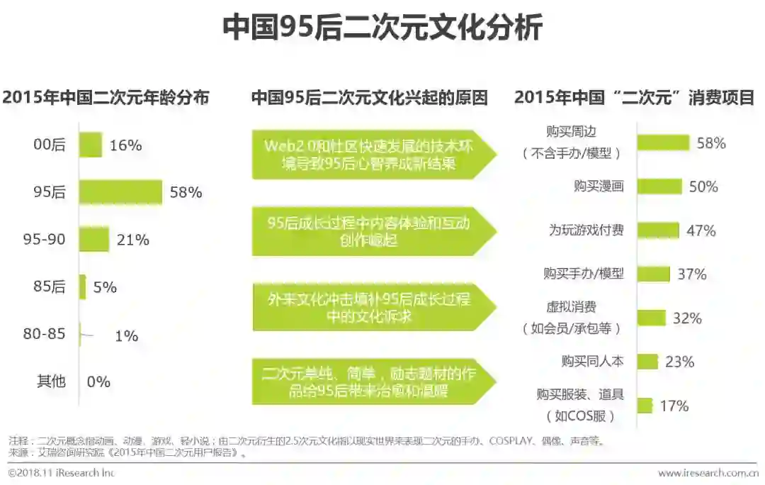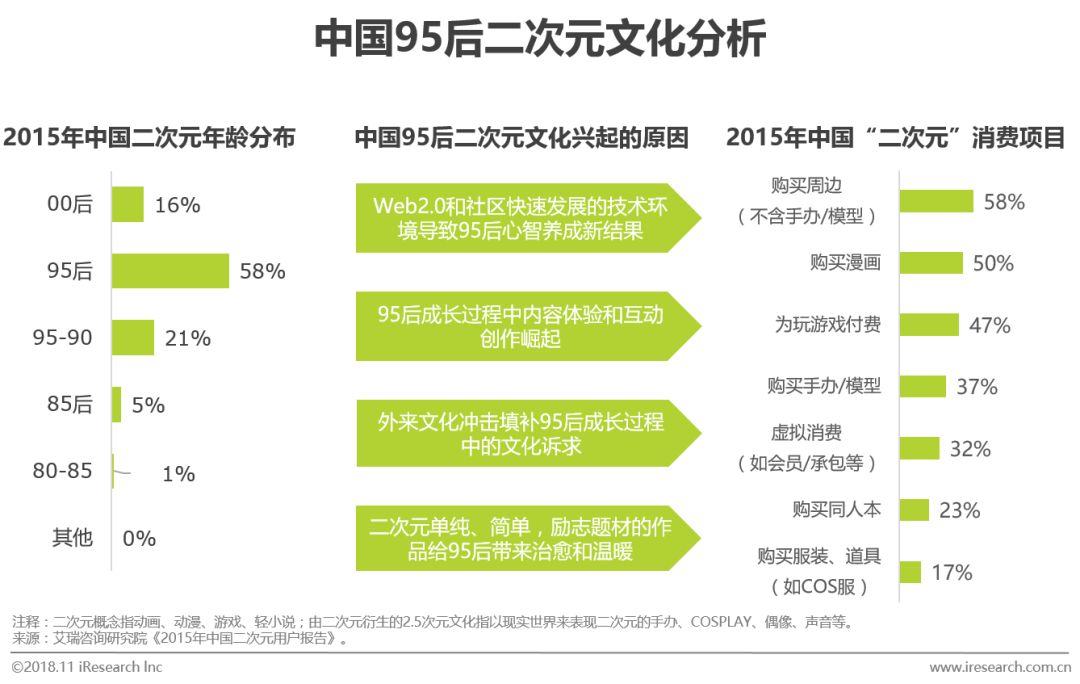 95后成长环境中,互联网的快速发展及外来文化冲击使得二次元文化深度植入95后的文化生活,二次元文化题材所表现的价值观符合95后的精神诉求。二次元人群的付费意愿很高,最爱周边、动漫和游戏。