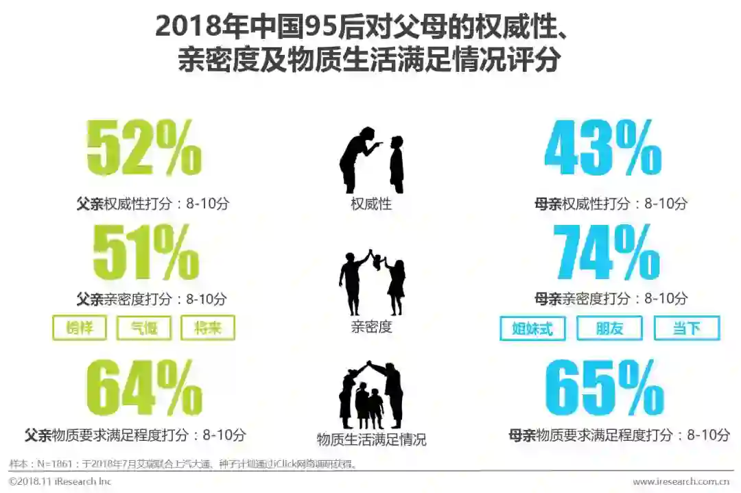 95后多与母亲更亲密;当前工作生活节奏紧张,父亲可能更忙于工作较少顾及家庭,存在家庭生活中父亲角色缺位的问题。