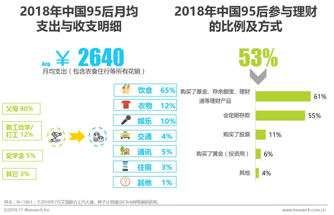 消费:95后月均花销2640元,高进高出;53%的95后养成了理财的习惯,余额宝、理财通等网络理财方式最为普遍。