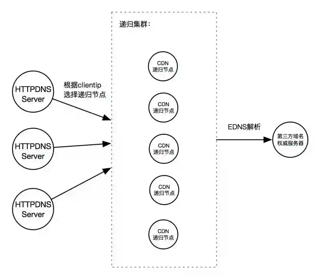对于第三方域名,百度 HTTPDNS 提供了一套广泛分布的递归集群,尽可能的模拟真实用户,基于 EDNS 协议从权威服务器获取最优解析结果。