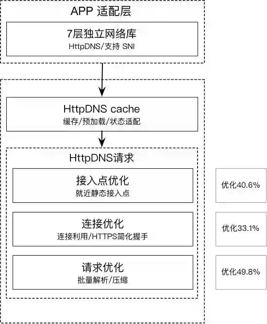 其次,综合考虑 HTTPDNS 请求的时延特性,在端上提供适当的 cache 预加载 / 更新策略,提升 HTTPDNS 覆盖率。