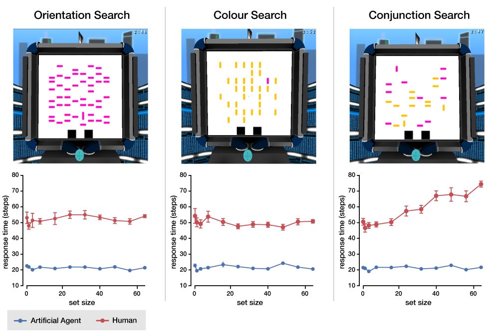 当要求人类“在水平线段中找出竖直线段”和“在其他颜色的线段中找出粉条的线段”的任务时,人类的反应时间不会根据屏幕上的线段数量的改变而改变。换句话说,他们的反应时间与“数据大小”是相互独立的。然而,当任务改为在不同形状和不同颜色的线段中找出粉色线段时,每增加一个线段,人的反应时间会增加大约50ms。当人类在Psychlab上完成这个任务时,我们也复现了这个结果。