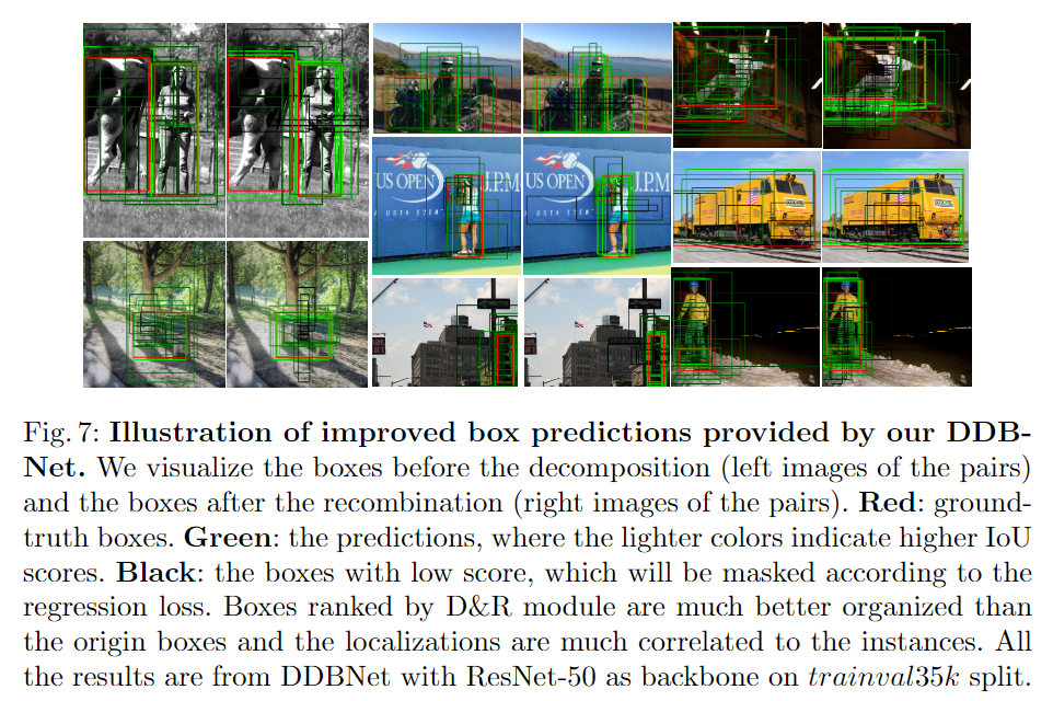 Anchor-free目标检测方法中精确的边界框估计是这些方法成功的关键。但是,即使边界框具有最高的置信度得分,在定位环节仍然有一些瑕疵。为此,本文提出了一种box reorganization方法(DDBNet),该方法可以深入到box中以进行更准确的定位。具体来说,第一步将漂移的框(drifted box)过滤掉,因为这些框中的内容与目标语义不一致。接下来,将选定的框划分为边界(boundaries),并搜索排列整齐的边界,将其分组为更精确的框,从而更精确地拟合目标实例范围。实验结果表明,本文的方法是有效的,可实现最新的物体检测性能。