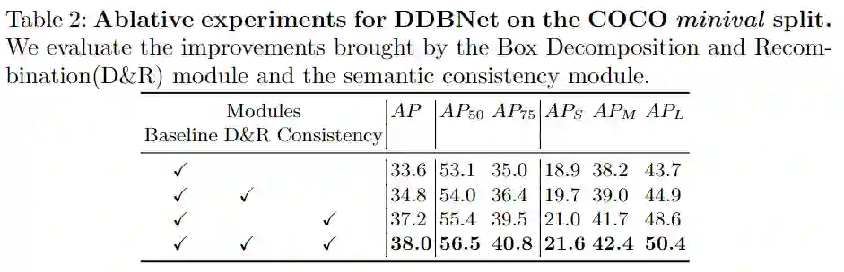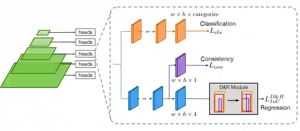 在本文中,基于FCOS构建了DDBNet,这是一种先进的anchor-free方法。如图3所示,本文的创新在于box分解和重组(D&R)模块和语义一致性模块。