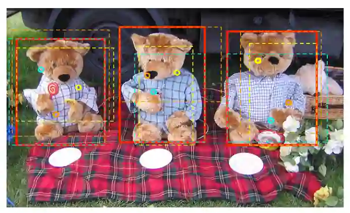 第二,局部回归( local wise regression)是受限的。具体而言,中心关键点通常以区域/局部方式提供框预测,这可能会影响检测精度。局部预测是由于卷积核的感受野的限制,以及将每个中心关键点的每个box预测视为原子操作而设计的。如图2所示,虚线的预测框和相应的中心关键点以相同的颜色显示。尽管每个预测的box都围绕着对象,但这是不完美的,因为四个边界不能同时正确地与ground truth对齐。因此,在推断阶段选择高分的box作为最终检测结果有时是较差的。
