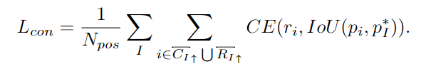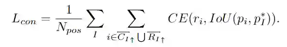 其中RI是背景真实度与目标实例I内像素的预测框之间的IoU得分,RI↓表示IoU置信度低于平均IoURI的像素。相反,RI↑表示具有比RI更高的IoU置信度的像素。元素ci∈CI是第i个像素的所有类别中的最大分类得分,表示类别数。类似地,CI↓表示具有比CI的平均得分低的分类得分的像素。在这种方法中,类别标签是不可知的,因此在训练期间不会抵制不正确类别的预测。最后,如图5所示,RI↓和CI↓中的交点像素被指定为负,而RI↑和CI↑中的并集像素被指定为正。同时,如果像素被多个实例覆盖,则它们优先选择表示最小的实例。