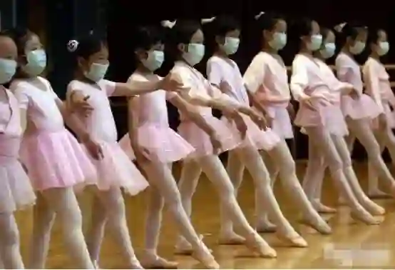 2003年4月27日,香港,参加芭蕾舞课程的孩子们戴着口罩练习舞蹈。