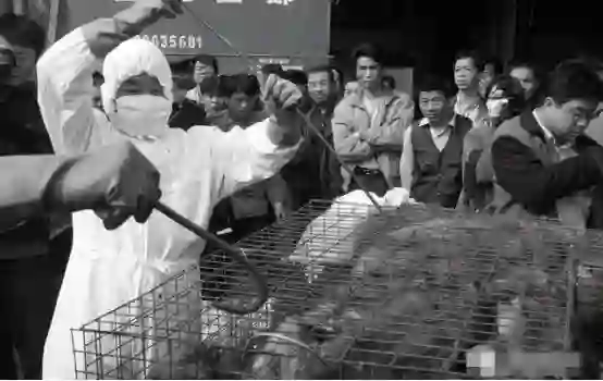 果子狸被怀疑是传染非典病毒的元凶,一度面临被灭杀的命运。图为2003年6月1日,广州,在某动物市场上,卫生健康工作人员搬运走装满狸的笼子。
