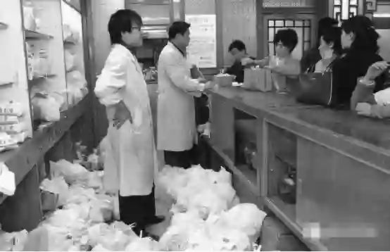 2003年4月9日,北京一家同仁堂药店中,人们购买据说可以预防非典的中药。在媒体报道了某中药可以预防非典后,这家药店一天之内卖光了三万副。