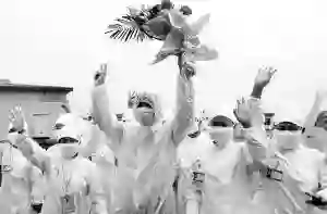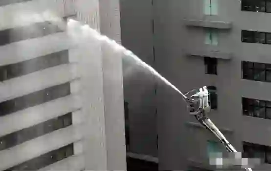 2003年5月14日,在非典事件疫情严重的台北和平医院身着防护服的消防员在高空喷洒消毒剂。