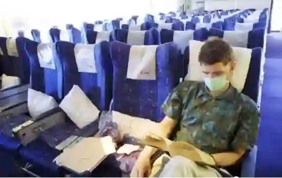 2003年6月5日,香港飞往北京的飞机上只有孤零零的一名外国乘客在看书,其他座位都空着。受非典影响,乘坐飞机的人数大幅减少,航空公司股票受到严重打击。
