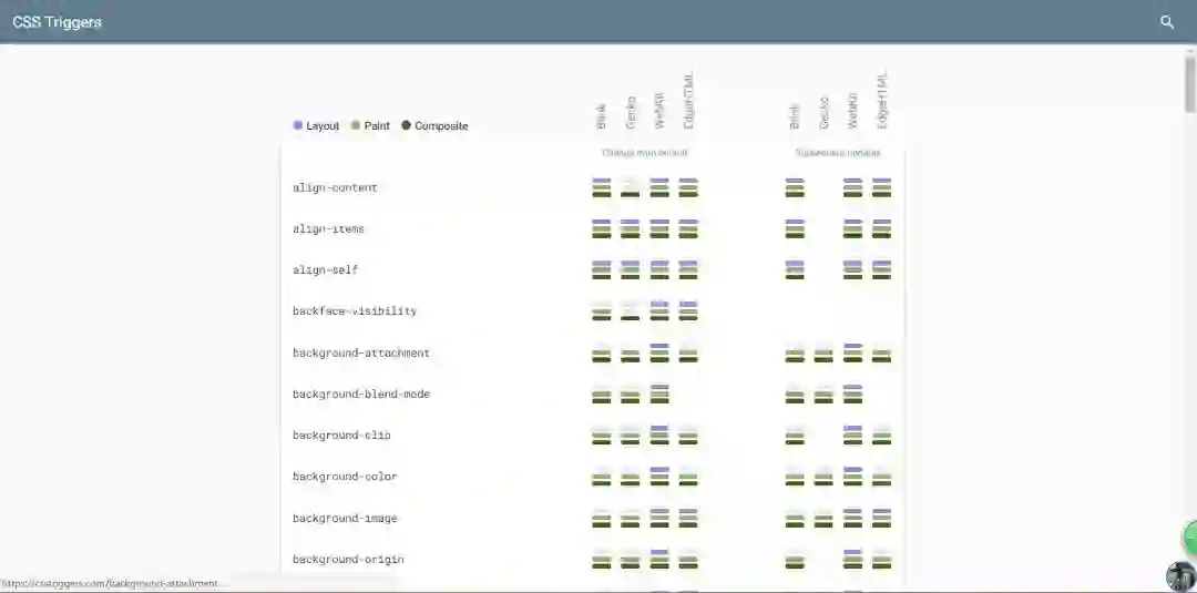 这里给大家推荐一个网站,里面详细列出了哪些 CSS 属性在不同的渲染引擎中是否会触发重排或重绘: