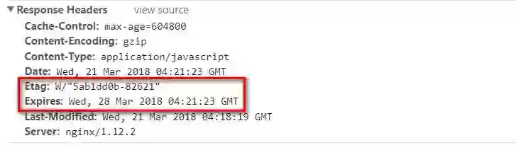 打开我们的网站,在 chrome devtools 的 network 面板中观察我们的请求资源,如果在响应头部看见 Etag 和 Expires 字段,就说明我们的缓存配置成功了。