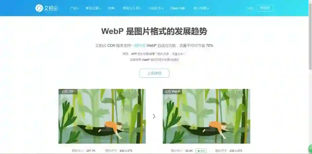 我们可以使用官网提供的 Linux 命令行工具对项目中的图片进行 WebP 编码,也可以使用我们的线上服务,这里我推荐叉拍云(网址:https://www.upyun.com/webp)。但是在实际的上线工作中,我们还是得编写 Shell 脚本用命令行工具进行自动化编译,测试阶段用线上服务方便快捷。(图片来自叉拍云官网)