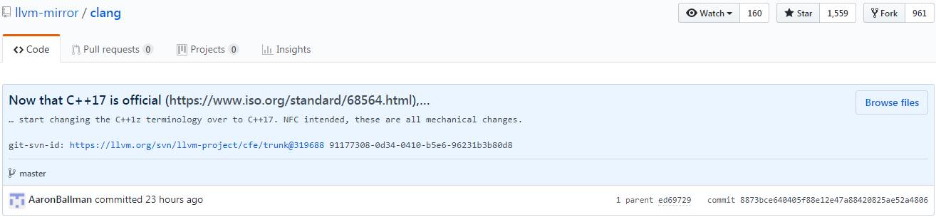 LLVM 的 Clang 编译器也已经将代码中出现“C++1z”的地方修改为“C++17”(C++ 17 曾被称为 C++1z)。GCC 和 LLVM/Clang 都有效地提供了完整的 C++ 17 支持。