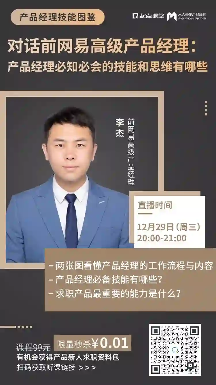 针对以上这些问题,12月29日晚20:00-21:00,【人人都是产品经理】联合【起点课堂】特邀前网易高级产品经理 @李杰老师,做客“起点课堂产品经理入门公开课”。