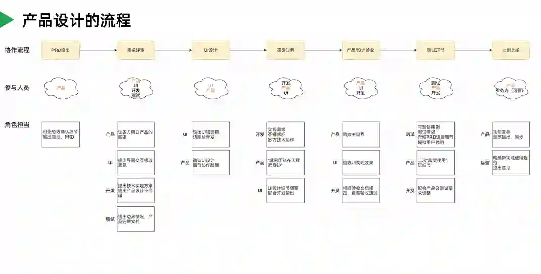 挖掘用户需求-需求分析,产品生命周期管理,定义产品功能,输出需求文档,原型图,各部门协调沟通,分析数据和用户反馈,改善用户体验,竞品分析...