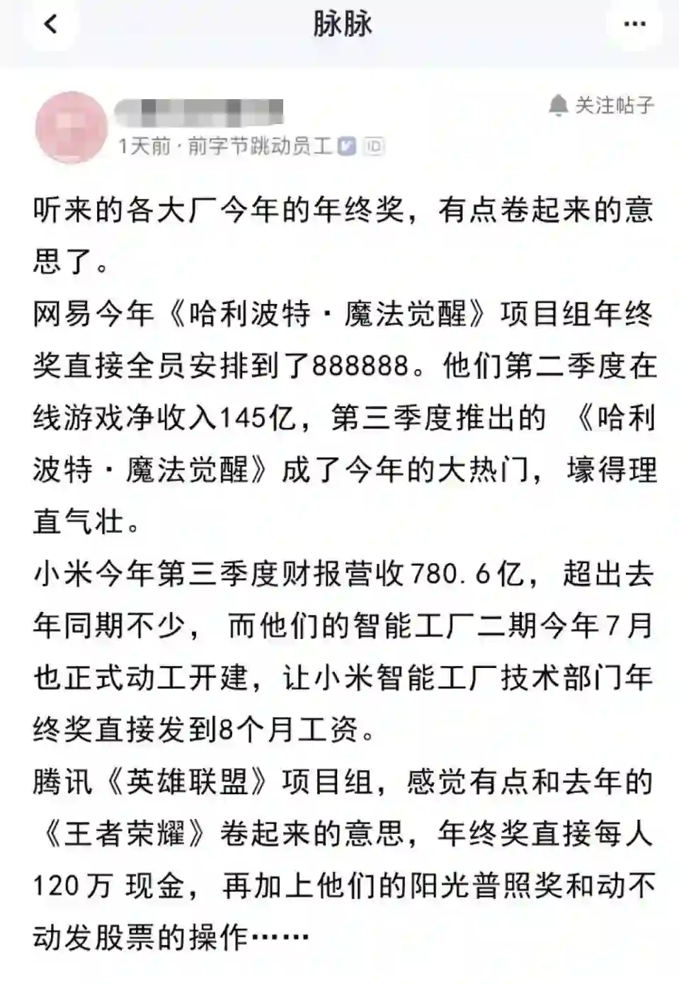 你没看错,网易《哈利波特》项目组年终奖直接给到了八十八万八,腾讯《英雄联盟》组员每人120万现金,小米智能工厂技术部门成员的年终奖可以发8个月工资!