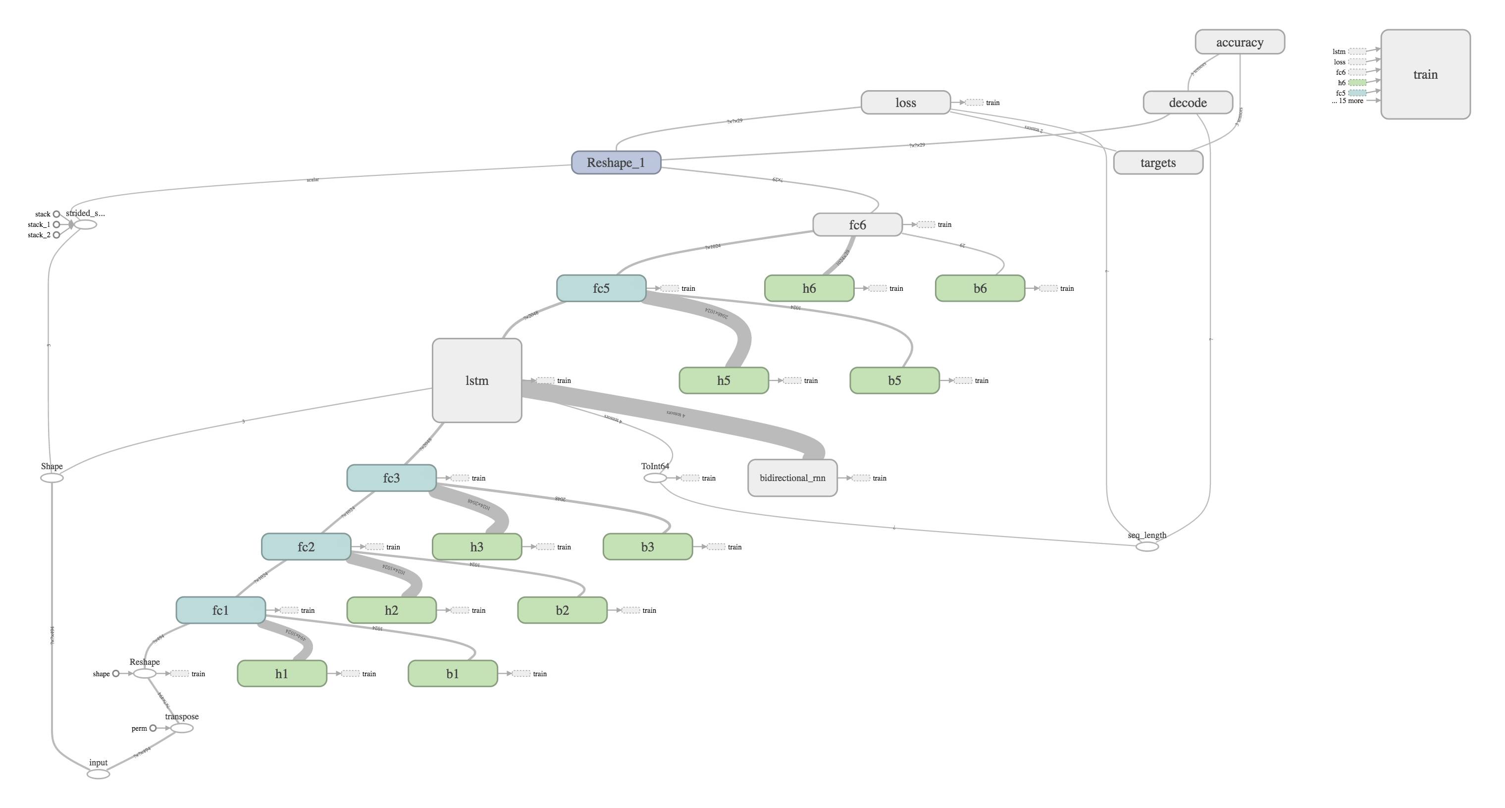 我们利用 tf.name_scope 添加节点和层名称,并将摘要写入文件,其结果是自动生成的、可理解的计算图,正如下面的双向神经网络(BiRNN)所示。数据从左下角到右上角在不同的操作之间传递。为了清楚起见,不同的节点可以用命名空间进行标记和着色。在这个例子中,蓝绿色 fc 框对应于完全连接的层,绿色 b 和 h 框分别对应于偏差和权重。