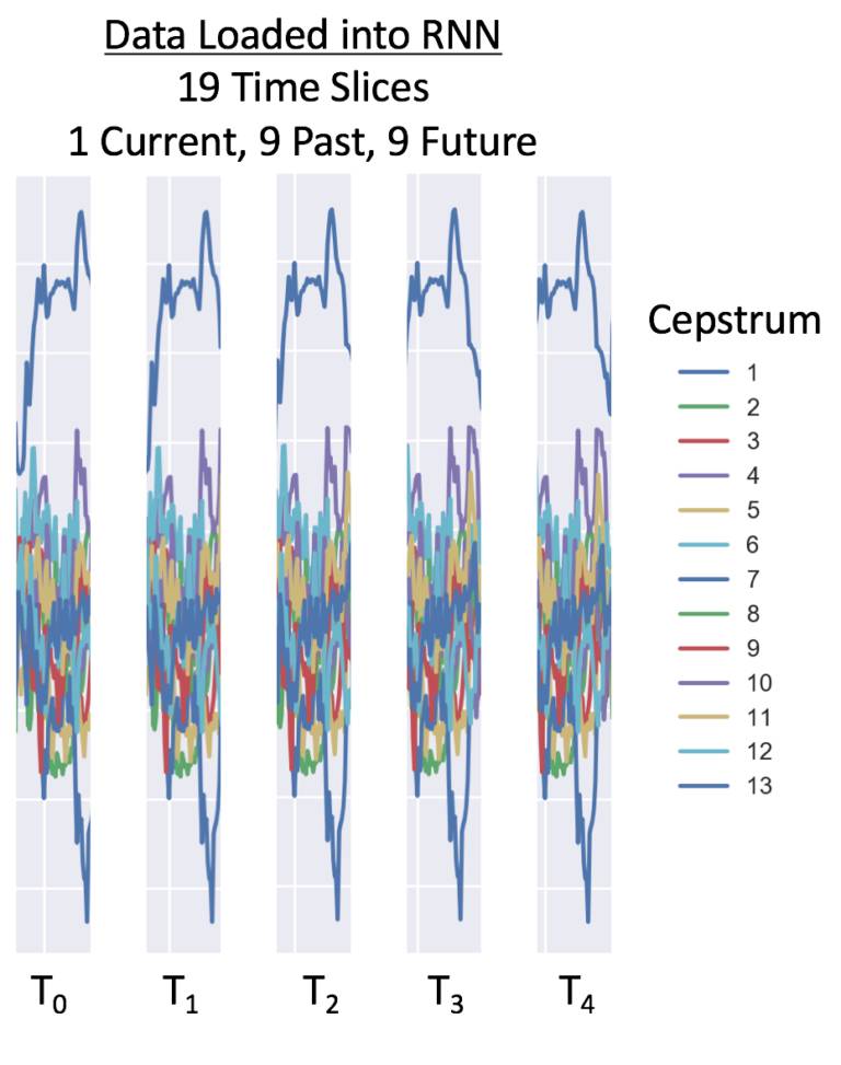 对于这个 RNN 例子来说,我们在每个窗口使用前后各 9 个时间点——共 19 个时间点。有 26 个倒谱系数,在 25 毫秒的时间里共 494 个数据点。根据数据采样率,我们建议在 16,000 Hz 上有 26 个倒谱特征,在 8,000 Hz 上有 13 个倒谱特征。以下是一个 8,000 Hz 数据的加载窗口: