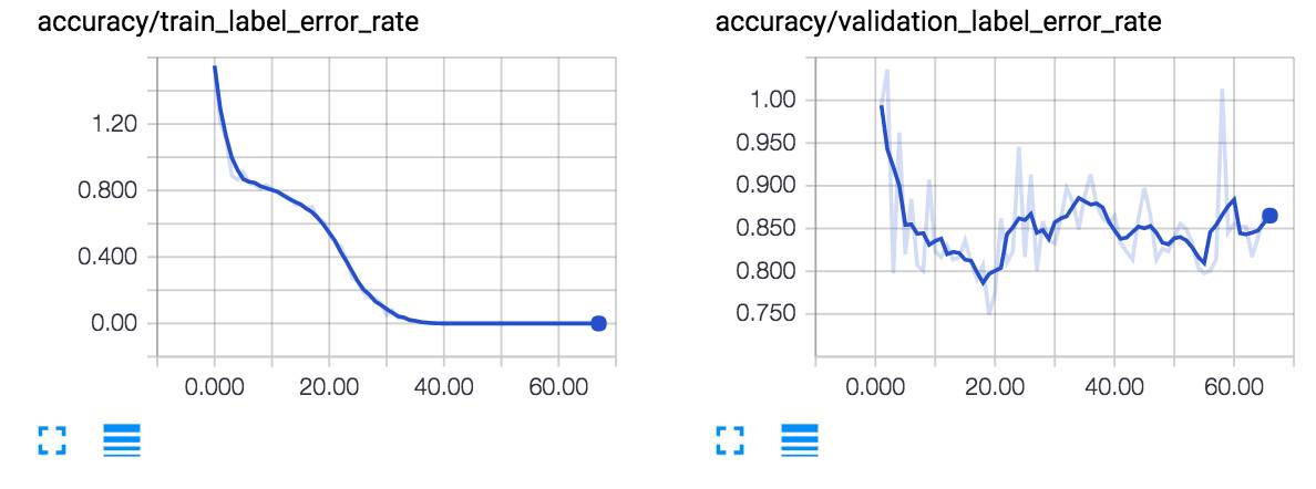 当训练这些示例数据时,你会很快注意到训练数据的词错率(WER)会产生过拟合,而在测试和开发集中词错率则有 85% 左右。词错率不是 100% 的原因在于每个字母有 29 种可能性(a-z、逗号、空格和空白),神经网络很快就能学会: