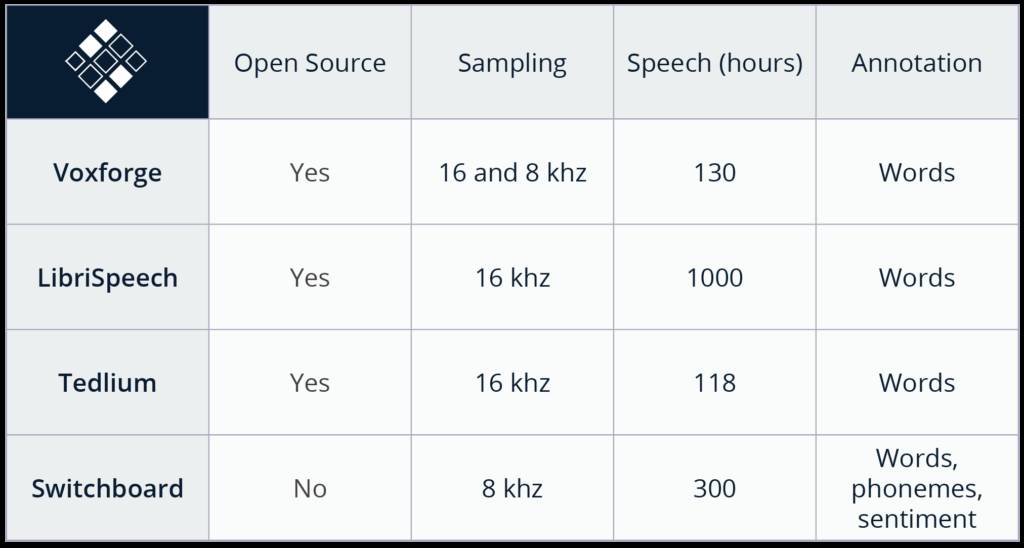 毫无疑问,训练一个将语音转录为文字的系统需要数字语音文件和这些录音的转录文本。因为模型终将被用于解释新的语音,所以越多的训练意味着越好的表现。SVDS 的研究人员使用了大量带有转录的英文语音对模型进行训练;其中的一些数据包含 LibriSpeech(1000 小时)、TED-LIUM(118 小时)和 VoxForge(130 小时)。下图展示了这些数据集的信息,包括时长,采样率和注释。