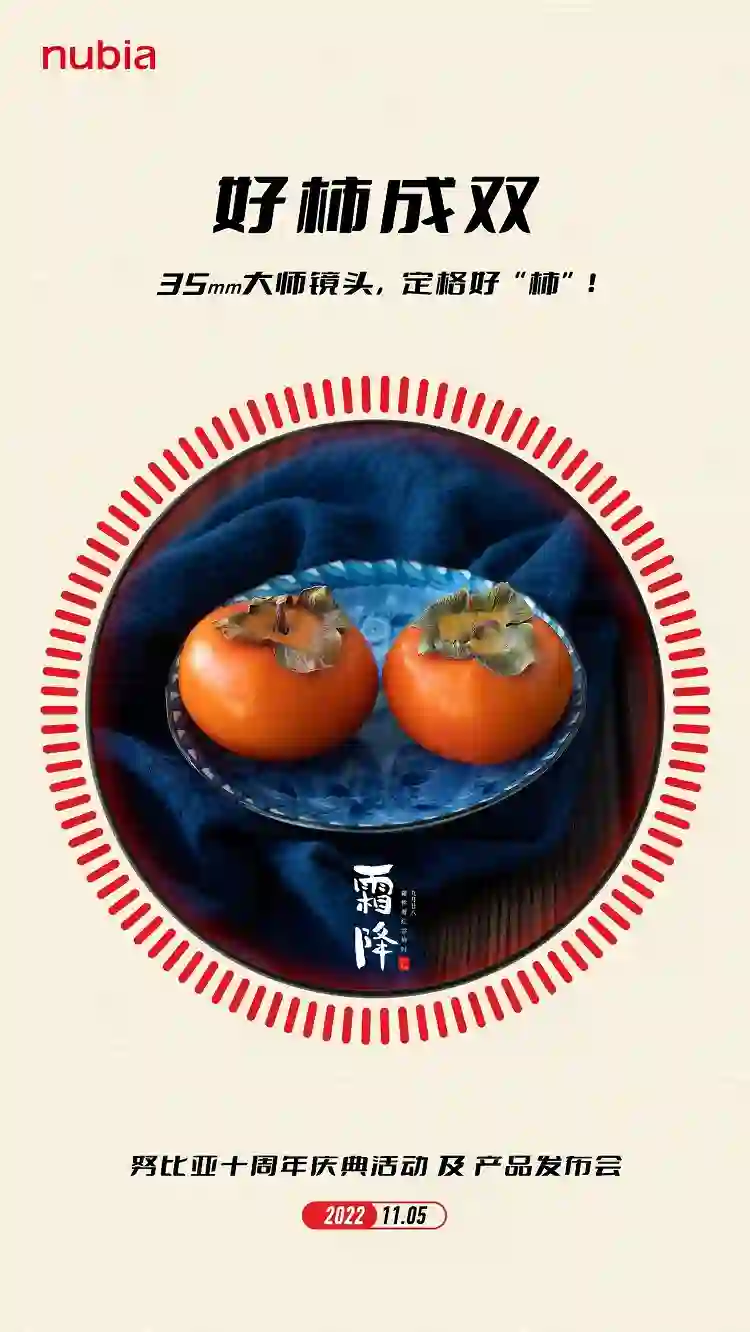 10 月 23 日迎来“霜降”,在此之际,努比亚手机官方宣布,十周年庆典活动及产品发布会将于 11 月 5 日举行。从官方的预热海报来看,图中写着“好柿成双”,或预示着官方或将在此次产品发布会上带来两款新品。但是官方并未大张旗鼓的公布将要发布的新品以及具体的活动,猜测新品可能是换色版本的手机。