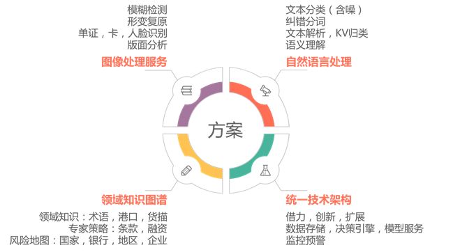 由于单证的类型很多,并且五成以上都是图像,集团内外最好的OCR产品,都存在至少一成的词识别错误,因此,需要抗噪能力强的文本分类模型,先将单证进行自动分拣归类。另外,即使字符的识别错误较少,由于没有针对领域进行优化和分词,无法直接阅读和无人化使用。因此,将识别结果进行领域相关的纠错分词,也是势在必行。然后,通过解析引擎进行内容解析和Key-Value关系重建,结合基于文本构建的领域知识图谱和风控策略,完成语义理解和智能审核。