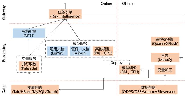 技术架构上肯定不能重复造轮子,而且必须考虑项目时间,以及业务和技术的可扩展性。因此,根据团队已有的沉淀,抽象出统一的技术架构。首先,所有的服务接口收拢到统一的任务引擎。然后,充分借力集团已有的成熟技术和平台,比如:雷音(OCR技术),阿里云(证件、人脸识别技术),MTEE(实时决策引擎),PAI(模型训练、部署平台)等等。最后,针对实际业务中面临的问题,在算法和模型上深耕并且落地创新。
