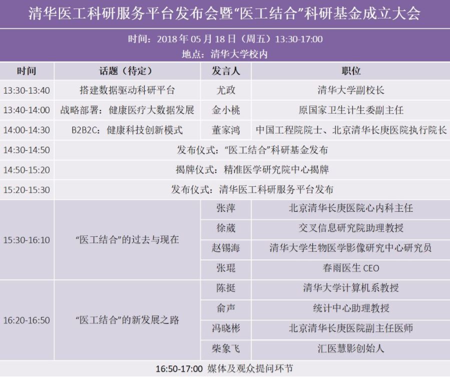 清华大学精准医学研究院将联合数据科学研究院于2018年05月18日举办“清华医工科研服务平台发布会暨医工结合科研基金成立大会”,邀请国家相关部委领导、数据科学领域的研究学者、医疗工作一线的实务人员共同参会。