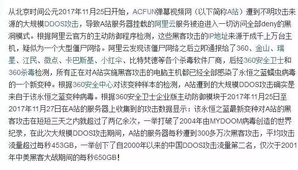 从北京时间公元2017年11月25日开始,ACFUN弹幕视频网(以下简称A站)遭到不明攻击来源的大规模DDOS攻击,导致A站服务器挂载的阿里云服务被迫进入一切访问全部deny的黑洞模式。根据阿里云官方的主动防御程序检测,这些黑客攻击的IP地址来源于成千上万台主机,疑似为一个大型僵尸网络。阿里云发现该僵尸网络之后立即通报给了360、金山、瑞星、江民、微点、卡巴斯基、小红伞、比特梵德等各个杀毒软件厂商,后经360安全卫士和360杀毒检测,所有正在对A站实施黑客攻击的电脑主机都已经全部感染了永恒之蓝蠕虫病毒的一个新变种。根据360安全中心对该变种样本的检测,A站遭到的大规模DDOS攻击确实是来自于该永恒之蓝变种病毒。根据360安全卫士企业版主动防御模块于2017年11月25日至2017年11月27日在A站的服务器上收集到的攻击数据显示:该永恒之蓝最新变种对A站的黑客攻击在短短三天之内就超过了两亿余次,一举打破了2004年由MYDOOM病毒创造的世界纪录,在此次大规模DDOS攻击期间,A站的服务器每秒遭到300多万次黑客攻击,平均攻击流量超过每秒453GB,一举创下了自2000年以来的中国DDOS攻击流量第二名,仅次于2001年中美黑客大战期间的每秒650GB。
