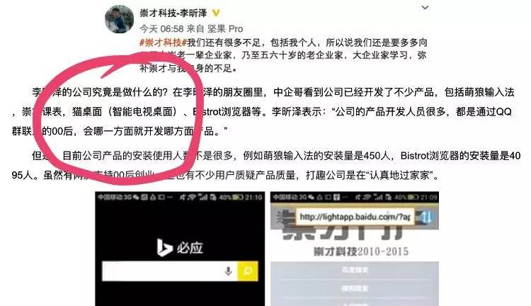 一开始我还以为别人只是引用了我的作品什么的,但打开其中的链接却发现,不是那么简单。这位所谓的“中国首位00后CEO”在公司产品列表公然写着“猫桌面”(截图如下)。