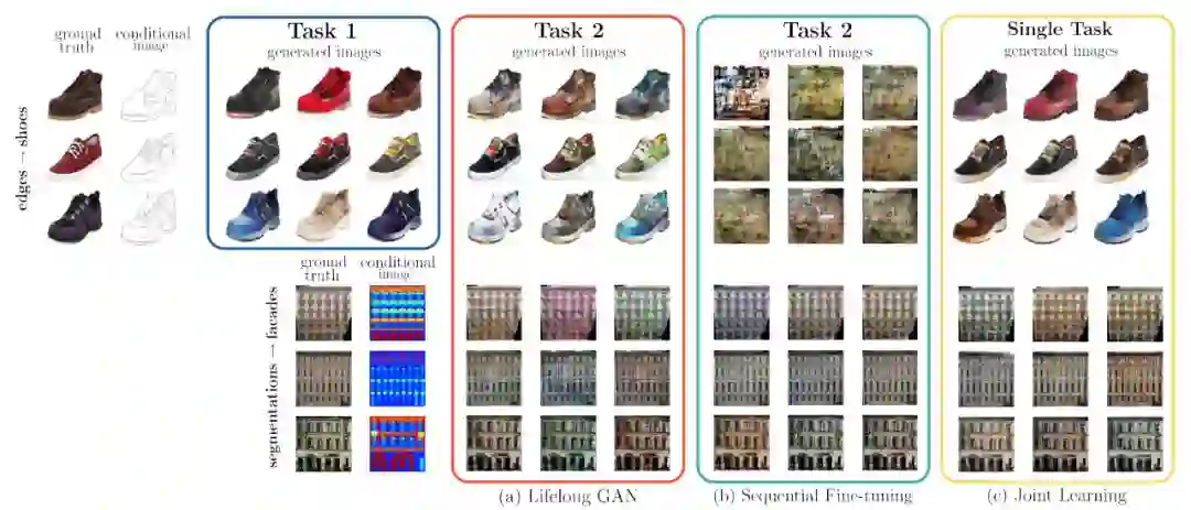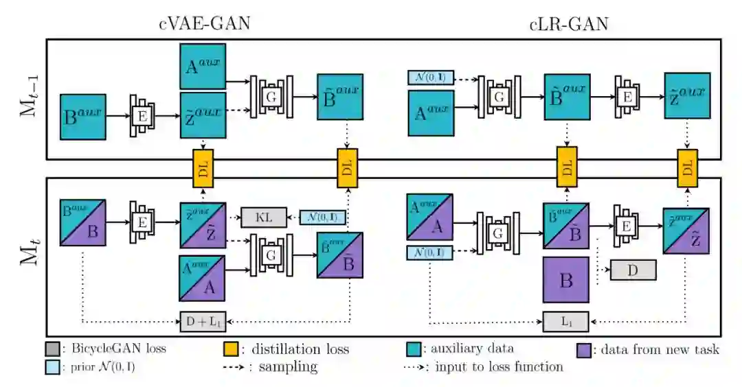这一问题对于持续学习而言是一个非常巨大的挑战,目前比较主流的解决方案是让当前任务数据集结合原数据集去训练模型,但这样会导致模型的可扩展性很差,当添加一个新的任务时存储和训练时间都会同时增加,并且有些预训练模型的数据是难以获取的,因此作者提出了更通用的持续学习模型框架,该框架用于解决条件图像生成问题。