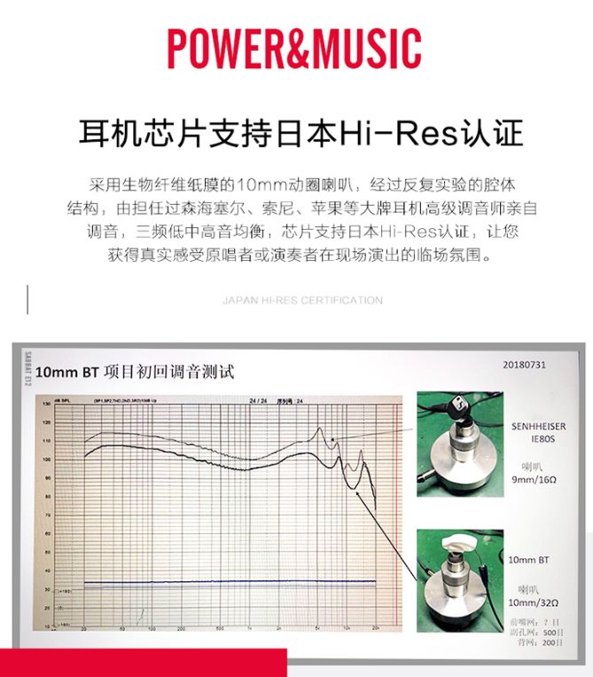 而蓝牙耳机不一样,而蓝牙耳机其实属于一种播放设备了,所以首先期望蓝牙芯片能达到小金标标准的采样率。然后整个蓝牙耳机的电路设计也要按着输出标准去设计。所以这家拿 Hi-Res 给自己背书的厂家产品,其实跟 Hi-Res 一点关系都没有,甚至连单元的频响范围都只是 20Hz-20kHz。