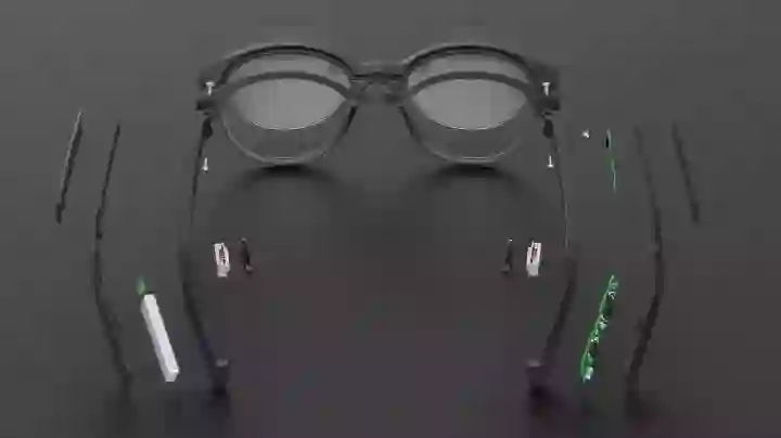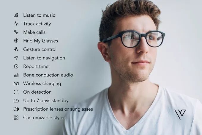 VUE 智能眼镜外观上与普通眼镜别无二致,镜腿中植入了智能芯片,通过骨传导播放声音,用户可通过手指轻触、双击、长按或滑摸眼镜腿来激发不同功能。
