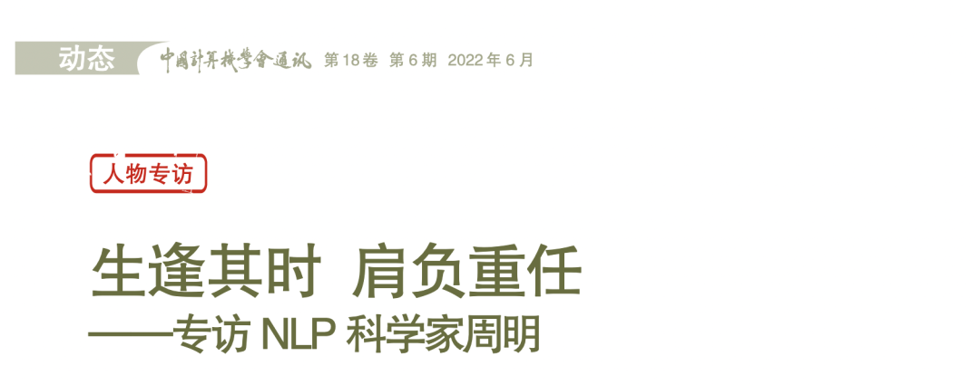 周明是世界顶级人工智能科学家,是自然语言处理领域的代表性人物,曾任微软亚洲研究院副院长、国际计算语言学学会(ACL)主席,现任中国计算机学会(CCF)副理事长(分管企业服务和会员发展)、中国中文信息学会常务理事、创新工场首席科学家。他还担任多所高校的博士生导师。他在自然语言处理领域发表的文章数量居世界前列。令人印象特别深刻的是,作为科学家创业,周明于2021年6月创办了澜舟科技公司。2022年3月,《中国计算机学会通讯》(CCCF)动态栏目编委委托清华大学副教授刘知远对周明进行了采访。希望周明的经历和见解能对自然语言处理领域的科研工作者和广大学生有所启发。
