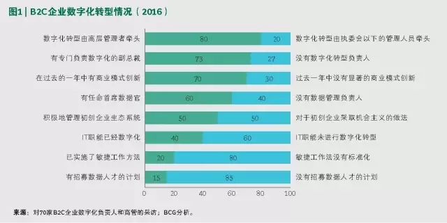 为了理解领先企业如何应对当前市场的变化和不确定性,BCG与IBM以及电子商务组织(Electronic Business Group,法国一家领先智库)合作,针对数字化转型的课题采访了70家B2C企业的高管(其中包括60家传统企业和10家纯数字化企业)。
