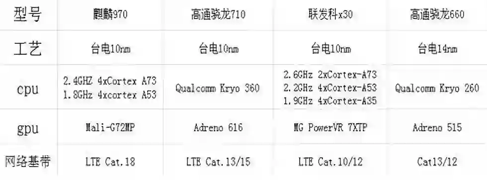 从定性上讲:麒麟970>骁龙710>联发科x30>骁龙660。