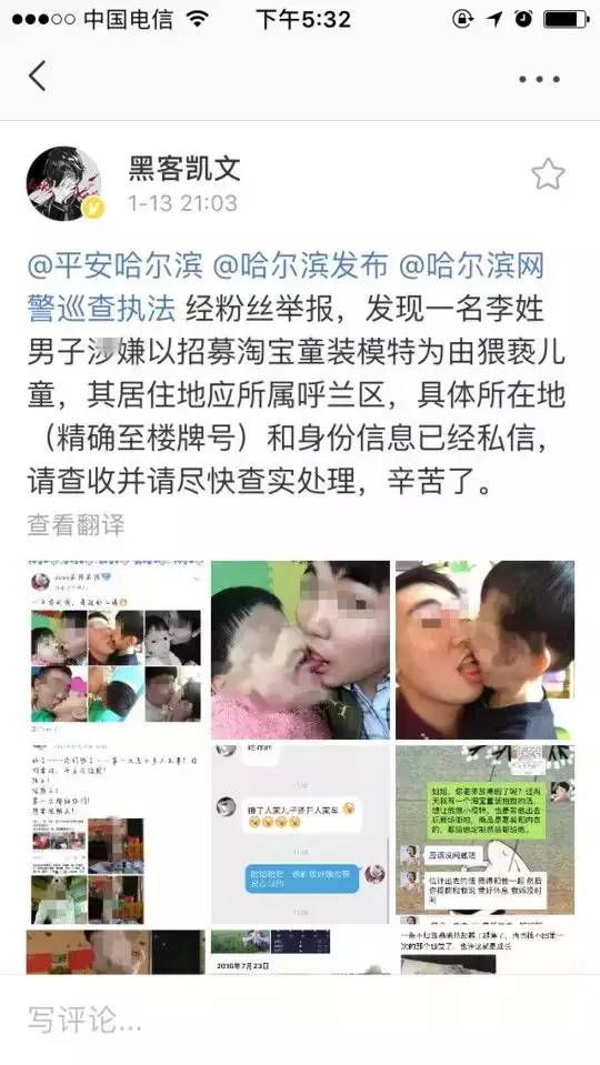 去年1月,微博大V黑客凯文爆料,哈尔滨一男子以招募淘宝童装模特为由猥亵儿童,还将自己和宝贝们舌吻的照片发在了网上。